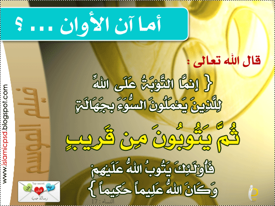 { إِنَّمَا التَّوْبَةُ عَلَى اللّهِ لِلَّذِينَ يَعْمَلُونَ السُّوَءَ بِجَهَالَةٍ ثُمَّ يَتُوبُونَ مِن قَرِيبٍ فَأُوْلَـئِكَ يَتُوبُ اللّهُ عَلَيْهِمْ وَكَانَ اللّهُ عَلِيماً حَكِيماً }النساء :17